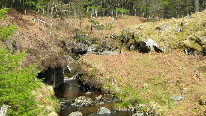 At Braentra, which is little more than a couple of houses on the edge of the forest, I sought a way onto the hill. I followed the hint of a path beside the burn but then had to cross the water to a gate through a towering deer fence. I held the rucksack high above my head, there being no turning space within the kissing gate. Next I had to cross the burn again and find a route under the Caledonian pines, avoiding the grass tussocks that separated the pines from the younger mixed woodland to my right. I kept checking the compass and made my way slowly up the slope towards open moorland and another huge deer fence. The gate was nailed shut.