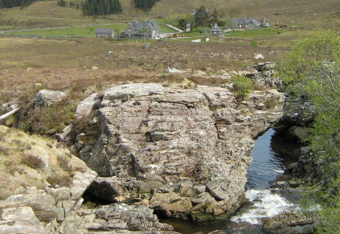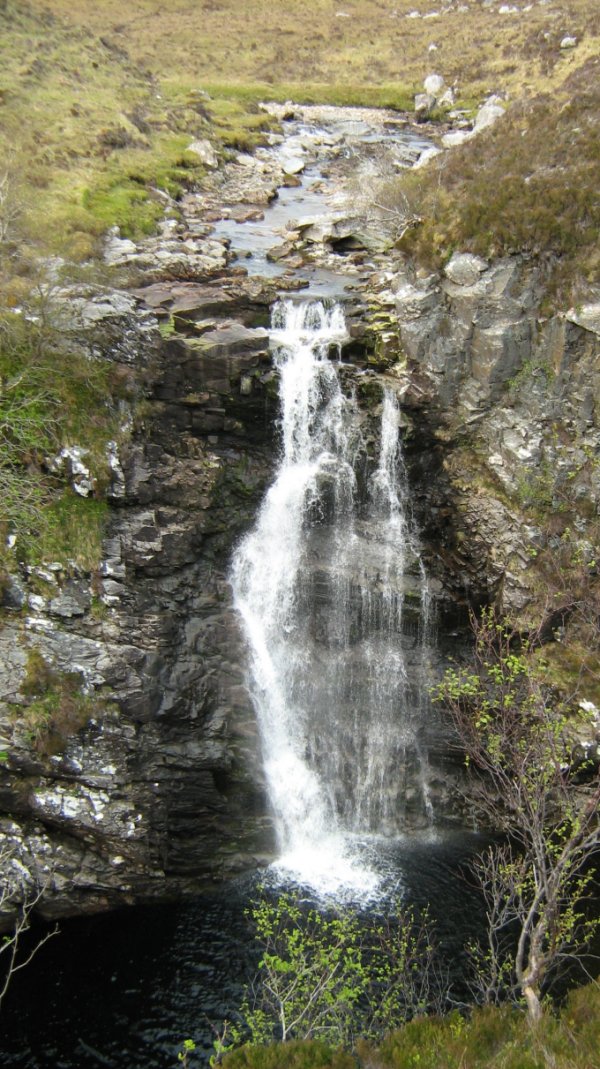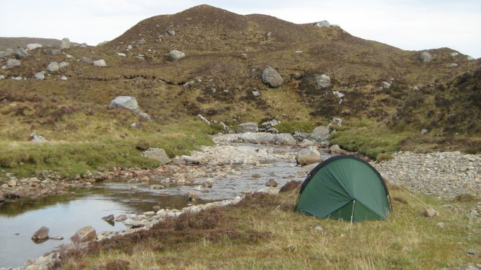 Heading up Glen Golly, I started looking for a pitch. There’s so much heather and peat that every green patch has to be considered as potentially a bed for the night. The green stuff is often sphagnum moss, which retains moisture, so it might not be the ideal material. Grass is a rarity, seen most often where drainage is good, and the best conditions I found were next to the burn. There gravel and sand had been left by countless floods. Vegetation had taken hold, and over the years it had established soil on top of a very effective drainage medium. I rested beside the gurgling burn, above the plunging waterfall, beneath a cloudless sky.