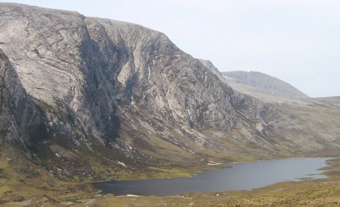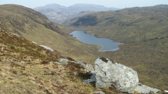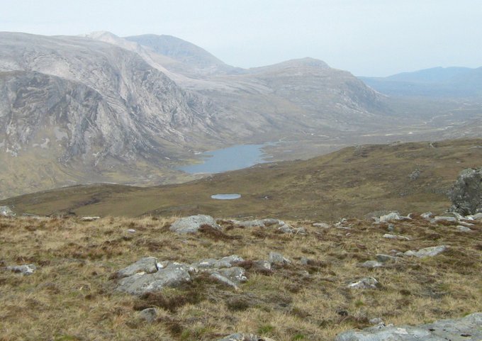 A small fishing boat drifted on Loch Dionard. Deer sprang out of a peat wallow, caked black as they ran from my harmless approach. Across the head of the valley, a working party was repairing a path. At the inflow to the loch I took off my boots and socks to ford the stream, and then I stripped off and sat in the sun to gather my strength for the awkward negotiation of a steep headland and the easier ground beyond.