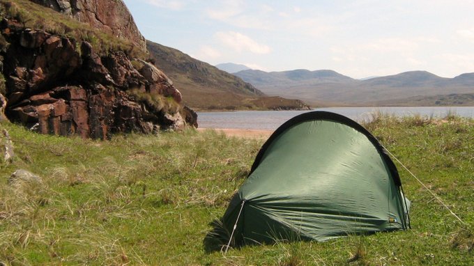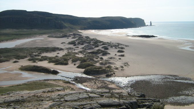 The path to Sandwood Bay is easy, passing small lochs with beaches of wind-blown sand. The bay looked larger than I’d expected, with a greater expanse of sand dunes between the loch and the sea. I picked out a likely pitch beneath a rock outcrop near the loch. Once the tent was up I went for water from a stream that fed the loch, then I had a brew and did my washing. I switched on my phone: no signal, as I expected, but what surprised me was that it was only early afternoon. My prompt start had paid off, so I relaxed, strolled, paddled, explored and pottered about at my whim throughout the rest of the day. I was unaware of anyone else at Sandwood Bay that night.