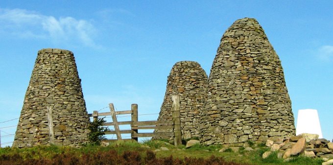 Another early breakfast set me up for a taxi ride round the hill to Yair and a steady climb through the forest to the Three Brethren. These three stone cairns stand close together, each in its own town where three boundaries meet.